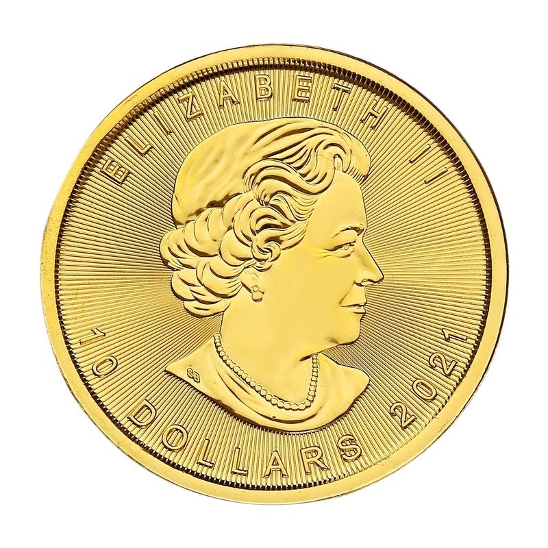 A brand new 2021 quarter ounce gold Maple Leaf coin. The Canadian Gold Maple is minted by the Royal Canadian Mint as the official bullion gold coin of Canada, and these smaller denominations offer the same classic design in a smaller coin.